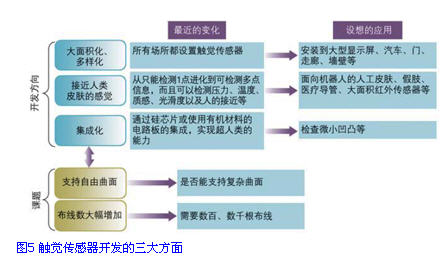 觸覺(jué)傳感器技術(shù)最近已真正開(kāi)始實(shí)用化,而且具有非常高的性能。具體來(lái)說(shuō),業(yè)界正在進(jìn)行以下三大方面的新技術(shù)開(kāi)發(fā)(見(jiàn)圖5):大面積化、使用場(chǎng)所及應(yīng)用的多樣化;目標(biāo)是具有人類(lèi)皮膚的感覺(jué),不僅檢測(cè)位置,還將檢測(cè)力度、壓力、溫度、表面凹凸、有無(wú)摩擦等;利用CMOS 工藝等進(jìn)行集成。