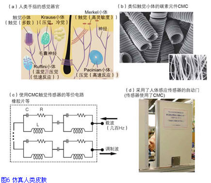 也有企業(yè)在開(kāi)發(fā)類(lèi)似人體感官的傳感器觸覺(jué)結(jié)構(gòu)。CMC技術(shù)開(kāi)發(fā)公司就利用被稱(chēng)為CMC 的線(xiàn)圈狀碳纖維制作了多款觸覺(jué)傳感器(見(jiàn)圖6)。所謂CMC就是將2 根直徑約1μm 的碳素纖維繞合成線(xiàn)圈狀,線(xiàn)圈直徑大約5μm~10μm,長(zhǎng)度約300μm。