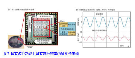 目前該小組已經(jīng)制作了多個(gè)可感覺(jué)溫度并分辨細(xì)微空間差別的觸覺(jué)圖形傳感器。該傳感器有幾mm2,其中排列了36 個(gè)像素,每個(gè)像素的大小約為150μm2~420μm2。每個(gè)像素里集成了應(yīng)力傳感器與溫度傳感器(見(jiàn)圖7a)。在該傳感器中,傳感器元件呈陣列狀排在感應(yīng)面,當(dāng)元件內(nèi)部形成空氣壓時(shí),感應(yīng)面會(huì)凸出。設(shè)計(jì)的原理就是通過(guò)凸出的感應(yīng)面壓向接觸面,從而測(cè)量凹凸及溫度等。