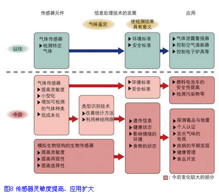 處于較領(lǐng)先地位的是聽(tīng)覺(jué)傳感器與視覺(jué)傳感器,此類(lèi)傳感器在信息處理、識(shí)別技術(shù)上的發(fā)展驚人。不久,應(yīng)該就可以從超高速動(dòng)態(tài)影像中提取出各種信息,并擴(kuò)大人類(lèi)視野,可以看到以前人類(lèi)看不到的地方。