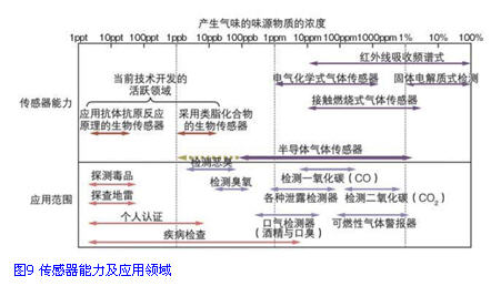 氣體傳感器有半導(dǎo)體式、電氣化學(xué)式、接觸燃燒式等多種類(lèi)型(見(jiàn)圖9),各類(lèi)傳感器可檢測(cè)的氣體濃度范圍及使用性各不相同。其中嗅覺(jué)傳感器大多采用了半導(dǎo)體氣體傳感器。
