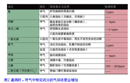 幽門(mén)桿菌是引起胃炎與胃潰瘍的主要原因。目前已有半導(dǎo)體氣體傳感器可以檢測(cè)CO2(二氧化碳)的濃度,從而判斷此病菌是否存在。而且此類(lèi)氣體傳感器已經(jīng)應(yīng)用到設(shè)備上,在日本已認(rèn)定為醫(yī)療設(shè)備。在美國(guó)等國(guó)家也在進(jìn)行各種疾病與氣味關(guān)系的研究,并在討論是否適用于實(shí)際診斷(見(jiàn)表2)。