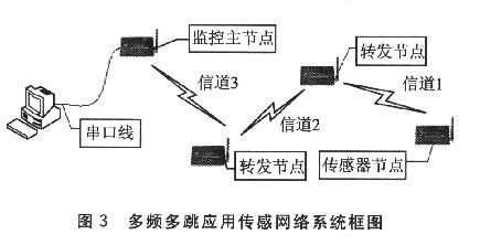 本設(shè)計的應(yīng)用場合中一旦形成拓?fù)渚筒辉佥p易發(fā)生變動。例如會展時在每個展覽品的底部添加傳感器模塊,那么在會展開始時讓鏈路自動尋找路由,會展期問就無需再變動。所以單純地向下遞推一個空閑信道作為發(fā)送信道是完全可行的。安裝網(wǎng)絡(luò)時只要依地理位置的遠(yuǎn)近順次開啟傳感模塊開關(guān),即可自組織一條路徑。監(jiān)控主節(jié)點與通用計算機以串口線相連,通過在通用計算機上運行監(jiān)控程序,對節(jié)點信息進行分揀,實現(xiàn)對傳感器數(shù)據(jù)進行管理。
