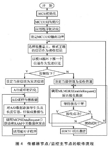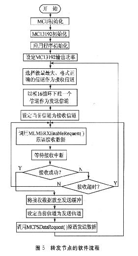 下面就以基于MC13192這一ZigBee射頻的節(jié)點組網(wǎng)為例,給出編程思想流程。編程基于Freescale公司提供的開發(fā)軟件平臺SMAC。圖2 中,傳感器節(jié)點、監(jiān)控主節(jié)點可以采用按鍵選擇相應(yīng)的功能,軟件流程如圖4所示。轉(zhuǎn)發(fā)節(jié)點,則可以采用圖5所示的編程思想。
