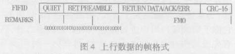 上行數(shù)據(jù)是指Tag 發(fā)送到Reader 的數(shù)據(jù)。上行數(shù)據(jù)幀的開(kāi)頭都包含有休眠和返回包頭字節(jié)部分,與下行數(shù)據(jù)一樣,上行數(shù)據(jù)的頭部數(shù)據(jù)都采用NRZ 編碼,不同的是,上行數(shù)據(jù)幀的返回?cái)?shù)據(jù)字和CRC- 16 校驗(yàn)字均采用FM0 編碼,這種編碼即在比特時(shí)間邊緣均發(fā)生電平跳變,若每比特時(shí)間中間發(fā)生電平跳變則代表數(shù)據(jù)0,否則代表數(shù)據(jù)1。其數(shù)據(jù)的傳輸帶寬是NRZ 編碼的兩倍。返回?cái)?shù)據(jù)的包頭字定義為32bits 二進(jìn)制數(shù)據(jù):00 00 01 01 01 01 01 01 01 01 00 01 10 11 00 01。其幀格式如下圖。