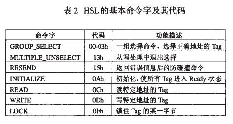 基于HSL 的Tag 通過(guò)執(zhí)行一系列由Reader 發(fā)出的命令,在三個(gè)狀態(tài)(READY、ID、DATA EXCHANGE)間切換,并完成防碰撞、EEPROM的數(shù)據(jù)讀寫(xiě)等操作。HSL 的基本命令字及其代碼如下表。
