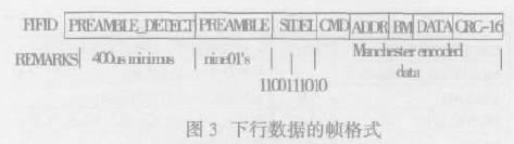 下行數(shù)據(jù)是指Tag 接收到的從Reader 發(fā)送過(guò)來(lái)的數(shù)據(jù)。在下行數(shù)據(jù)中,每幀的開(kāi)頭都包含有包頭檢測(cè)(PREAMBLE_DETECT)、數(shù)據(jù)包頭(PREAMBLE)和開(kāi)始標(biāo)識(shí)符(START DELIMITER) 三部分,它們均采用NRZ 編碼;數(shù)據(jù)幀包含其他數(shù)據(jù)如命令字、地址字和CRC- 16 校驗(yàn)字均采用Manchester 編碼,其數(shù)據(jù)的傳輸帶寬是NRZ 編碼的兩倍。采用18%和100%兩種ASK 調(diào)制信號(hào),波特率為8~40kBits/s。下行數(shù)據(jù)的包頭字為18bits 二進(jìn)制數(shù)據(jù):01 01 01 01 01 01 01 0101,而開(kāi)始標(biāo)識(shí)符在返回?cái)?shù)據(jù)波特率為接收時(shí)的1 倍時(shí),定義為11 00 11 10 10,為4 倍時(shí)定義為11 01 1100 10 1。數(shù)據(jù)的幀格式如下圖。