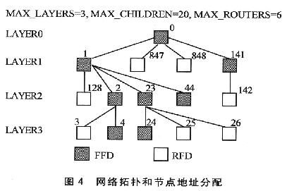 MAX_DEPTH決定了網絡的最大深度。協調器在最頂層,位于深度0;它的子節點位于深度1,依此類推。MAX_CHILDREN決定了一個路由器或者一個協調器可以處理的最大子節點個數。MAX_ROUTERS決定了一個路由器或者一個協調器可以連接的最大路由器的個數。這個參數是 MAX_CHILDREN的一個子集,終端設備使用(MAX_CHILDREN-MAX_ROUTERS)剩下的地址空間。圖4為使用自定義棧配置后的網絡拓撲和節點地址分配示意圖。LAYER1最多20個節點,其中包含6個路由節點。