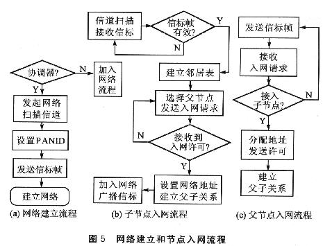 在網絡初始化過程中,協調器先將自身設置為一個簇標識符為0的簇頭,并向臨近的設備以廣播方式發送信標幀。接收到信標幀的設備(路由器或終端設備)向簇頭請求加入網絡,如果作為父節點的協調器允許該設備的加入,則將其作為子節點加入到它的鄰居表中,同時,請求加入的設備將協調器作為父節點加入到鄰居表中,成為從設備。已經加入網絡的路由器也廣播信標幀,以這種方式,直到所有設備都接入網絡。在接入網絡的同時,廣播信標幀的父節點會向接人的子節點分配唯一的 16位網絡短地址。圖5是網絡建立和節點入網流程。