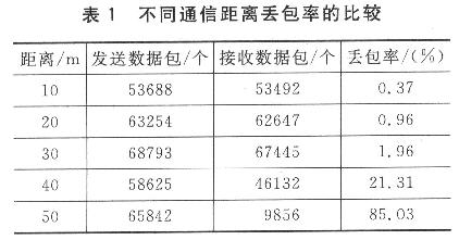 通信距離測試:CC2430芯片工作電壓為3.3 V,射頻發送功率0 dBm,空曠地帶可靠傳輸距離30 m。功耗測試:CC2430射頻發射峰值功耗30 mA,接收峰值25 mA,休眠狀態0.1μA;為了保證實時監控,傳感器得24小時工作,由此選擇了低功耗的傳感器。節點整機平均電流消耗17 mA。UPS功能測試:路由器接上220 V市電,正常入網后拔掉電源插頭,節點不掉電,不重啟;工作一段時間再插上電源,節點無死機,不重啟,充電芯片給電池正常充電。表1為不同通信距離節點數據包丟包率比較。丟包率在2%以下時,認為數據可靠傳輸。