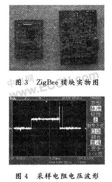 系統各種節點的硬件采用模塊化設計,ZigBee模塊實物如圖3中左邊所示,CC1100模塊如圖3中右邊所示。總體結構緊湊合理、體積小。在晴朗天氣條件下的空曠地區,測得ZigBee節點之間的有效通信距離可達120 m,433 MHz射頻模塊的有效傳輸距離可達400 m;工作在室內條件下時,ZigBee無線信號可以穿透1堵混凝土墻,433 MHz射頻信號可以穿透4堵混凝土墻,有效地克服2.4 GHz射頻信號穿透性差的弱點。在ZigBee終端節點的電源電路中串聯接人1 Ω電阻,用示波器測得終端節點工作過程中,電阻兩端的電壓波形如圖4所示。