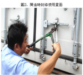 在“高雄港轉口柜免押運計劃”之貨柜運輸安全監控系統中應用到的RFID 硬體設備,含攜帶式的RFID 讀取器(查驗方式如圖1)、一次性使用的電子封條(開倉時須破壞,如圖2)。