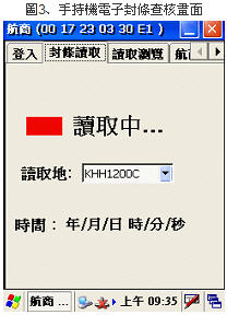 為了不增加使用者在手持機操作上的負擔或困擾,當要查核電子封條時,我們手持機系統操作,設計成在封條讀取的操作頁面上,只需按扣手持機手把上的板機,手持機就會去讀取電子封條,使用者即可由畫面的顯示判斷電子封條查核的結果(如圖3)。