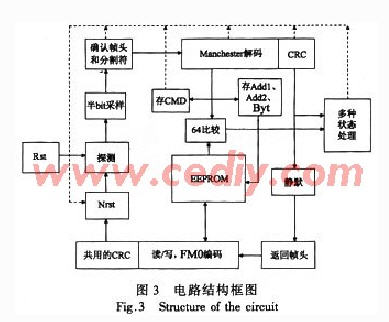 閱讀器與標簽以幀為單位進行數據傳輸,設計的時候則以標簽一幀的接收處理直至返回幀結束為一次完整命令。一次完整命令從上電復位或者上一命令結束開始,按照幀的格式,進入400μs幀頭探測段,然后從幀頭的第一個0中采樣取得半bit信息,用于以后的編解碼。等確認過幀頭和分割符,則進入Manchester解碼和相關數據處理的階段,此為接收幀信號的主要階段。解碼結束如果CRC正確,就可以開始對命令進行相應處理。先進行命令相關的狀態處理,同時返回幀的靜默。約200μs后,發送返回幀頭,進入命令相關的讀寫數據處理,編碼返回值,并加上CRC的結果,最后復位,等待下一命令的到來。圖3為按照命令執行步驟而設計的電路結構框圖。以下詳細說明各個部分。