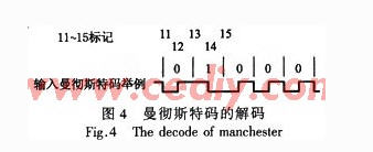 確認幀頭和分割符:幀頭和分割符是固定值,根據C_halfbit點數設定電平變換范圍和次數。如果出錯,進入Nrst,復位重新開始下一命令。Manchester解碼:曼徹斯特碼以0到1二位表示傳輸值零(圖4中11~13),以1到0二位表示傳輸值1(圖4中13~15),其特點是一位碼中間(如12和14處)必有0與1的跳變。解碼時從跳變處開始計數,在C_halfbit值加5與2倍的C_halfbit加6之間,若是出現Din與上一個時鐘的Din不同,則說明有變號,也就是說解碼成功,碼值為上一個Din的值。如圖4中13~14那一段,為1解出傳輸值1然后重新開始記數解下一碼。若是記數超出上面的范圍,那么認為解碼錯誤,進入Nrst。至于第1位碼,它前面是分割符,從分割符“1100111010’’的最后一個0起始處開始解曼徹斯特碼即可。解碼的同時判斷Cmd、Add1(解碼時用)、Add2(編碼時用)、Byt等,并將相應內容存下來,在需要與EEPROM比較時進行實時比較。全部解碼值隨解碼的過程都送入CRC,到設定的判定條件進行判斷,正確的話繼續進行下一步,錯誤則進Nrst。