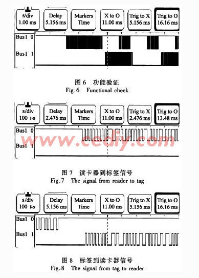 將代碼下載到FPGA板上輸入測試信號,在邏輯分析儀中查看波形,如圖6,Bus1_0為輸入,Bus1_1為標簽的返回信號。Bus1_1根據Busl_0不同而做出相應不同的反應,并且能屏蔽返回值時可能有的Busl_0信號,如第二、四幀不做處理(處理一、三幀中)。圖7與圖8為接受信號與返回信號的起始處放大圖。