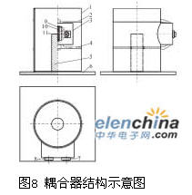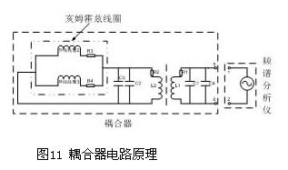由于在計算中沒有慮及線圈的分布電容C’,因此,根據公式(3)計算得到的82PF電容值實際上是應答器中的分布電容C’和調諧電容C的總和。若將82PF作為調諧電容值匹配到線圈上,則線圈的總電容值增大,LC回路中的所得到的諧振頻率 必定比要求的8.2 小,將不能與閱讀器產生諧振,因此必須修正調諧電容值。在修正調諧電容值的過程中要反復的檢測修正以后的電子標簽的諧振頻率,這就需要有專門的儀器來測量電子標簽的諧振頻率,由于目前還沒有用來檢測無源電子標簽諧振頻率的合適的儀器,所以筆者自己設計了一款耦合器,這種耦合器通過實驗可以很好的完成檢測電子標簽諧振頻率的工作,下面我們來詳細介紹這款耦合器。