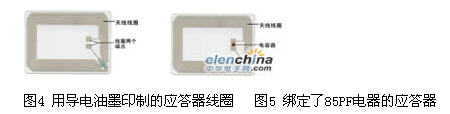 如圖4所示為筆者用導電油墨印制的應答器線圈,根據閱讀器發送頻率的要求,所制作的應答器的諧振頻率f應為8.2 。通過電感測試儀測得線圈電感的大概值為4.5 。
