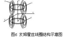 耦合器的核心部分是兩組圍繞在中空圓筒體上的半徑為r、匝數為N的線圈2、3,兩組線圈平行共軸,中心間距L正好為線圈半徑r,從而構成了一個亥姆霍茲線圈[5-6]。如圖6所示。