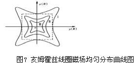圖7曲線“I”、“II”、“II”內各點的磁感應強度H與中心點的磁感應強度H0的相對誤差分別小于1.0%、0.1%和0.01%,中心點0附近的磁場相當均勻,越靠近中心點,磁場均勻性越好。因此,檢測無源RFID應答器頻率時,把應答器放在亥姆霍茲線圈所產生的磁場空間的中心點O上,以使應答器平面上各點所得到的磁場均勻,磁感應強度幾乎相等。