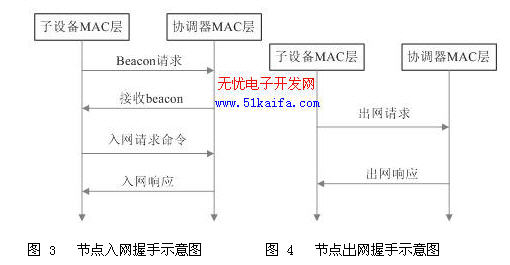 無線傳感器網絡除了節點有自組網能力外,還具有自愈和自節能的特點。當某一節點因為某種客觀環境原因或是原傳感網參數發生變化,導致此節點和傳感網脫離,脫離節點可以發送孤立(orphan)顯示請求幀給協調器,協調器在接收到請求幀后確定此節點是不是自己原先的孩子節點,在做出判定后向該節點發送響應幀,以確定是否重新接收該節點為自己的孩子節點。圖5 為orphan請求的握手示意圖。