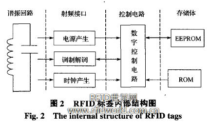 RFID標簽(Tag,即應答器)I 用于標識目標對象,由耦合元件及芯片組成。RFID標簽芯片基于“RF+Logic Controller+EEPROM”架構,芯片可劃分為諧振回路、射頻接口電路、數字控制和數據存儲體4部分,其內部結構如圖2所示。