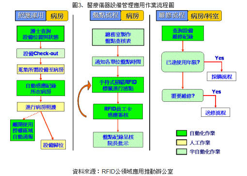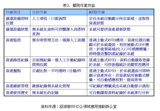 驗證測試證實RFID技術在醫療儀器設備管理應用的運用流程具有管理效益。除整合了主動式RFID與無線網路技術,作為現階段解決方案之外,亦驗證現有醫療儀器及設備可運用一般物流用被動式貼紙標簽,可降低導入經費。透過RFID技術除簡化人工與紙本紀錄處理模式,在照護過程中,亦可藉由即時發送警示,降低設備遺失機率;并強化臨床照護管理,提升作業效率。