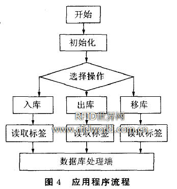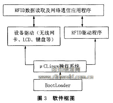 系統軟件框圖見圖3。本系統采用U-Boot軟件開發系統的BootLoader,操作系統采用了μCLinux。RFID數據讀取及網絡通信應用程序的流程見圖4。