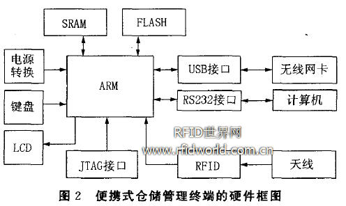 便攜式倉儲管理終端的硬件框圖見圖2。可以將硬件分為ARM 核心及外圍部分和RFID部分。