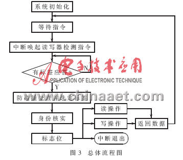 每個電子標簽由耦合元件及芯片組成,內(nèi)部一般保存有約定格式的電子數(shù)據(jù),且具有無法修改、仿造、全球唯一的識別號(UID)。在HF頻段RFID系統(tǒng)中,當(dāng)讀寫器處于工作狀態(tài)時,與其相連的天線線圈不斷地向外發(fā)出一組固定頻率(13.56MHz)的電磁波。當(dāng)無源電子標簽進入讀寫器工作區(qū)域時,在該電磁波的激勵下,標簽內(nèi)的LC串聯(lián)諧振電路產(chǎn)生諧振,從而使電容充電而產(chǎn)生電荷。該電容又通過一個單向?qū)щ姷碾娮颖茫瑢㈦娙輧?nèi)的電荷泵送到另一個電容內(nèi)存儲。當(dāng)后者充電達到2V時,它就可用作為標簽內(nèi)部其他電路的工作電源。標簽芯片中的有關(guān)電路對讀寫器發(fā)來的信號進行解調(diào)、解碼、解密,然后對命令請求、密碼、權(quán)限等進行判斷。若為“讀”命令,控制邏輯電路則從存儲器中讀取有關(guān)信息,經(jīng)加密、編碼、調(diào)制后通過標簽內(nèi)部天線再發(fā)送給讀寫器;若為修改信息的“寫”命令,有關(guān)控制邏輯就會使內(nèi)部電荷泵提升工作電壓,以擦除EEPROM中的內(nèi)容并進行改寫;若經(jīng)判斷發(fā)現(xiàn)所對應(yīng)的密碼和權(quán)限不符,則返回出錯信息[2]。