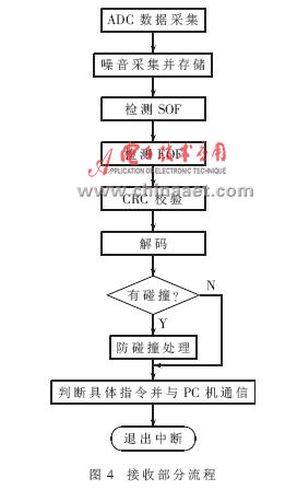 讀寫器應(yīng)用于開放式門禁系統(tǒng)時,需要PC機監(jiān)控,兩者以主從方式工作。主控模塊上電復(fù)位完成初始化后,進入等待狀態(tài)。當(dāng)PC機發(fā)來指令后,中斷喚醒主控模塊接收指令并處理相應(yīng)程序,完畢后將信息返回PC機并再次進入等待狀態(tài),總體流程如圖3所示。當(dāng)中斷喚起讀寫器發(fā)送命令并已檢測到有標簽進入時,便進行接收。接收部分流程如圖4所示。主控模塊在發(fā)出命令后,立即對模擬板發(fā)來的信號ADC采樣,并不斷采集噪聲,隨后完成檢測數(shù)據(jù)、解碼、校驗、防碰撞等處理,最后將標簽信息發(fā)回PC機,退出中斷。