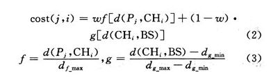 階段3:成簇階段簇頭向網(wǎng)絡(luò)所有節(jié)點廣播自己成為簇頭的消息HEAD_AD,內(nèi)容為簇頭節(jié)點的標(biāo)識及該節(jié)點與基站的距離。普通節(jié)點接收到此消息后選擇一個通信代價cost(CH)最小的聚類加入,并發(fā)送消息JOIN_REQ。通信代價表達(dá)式為: