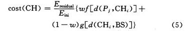 式(5)中參數(shù)與式(2)和式(4)表示的意義相同。從式(5)可以看出,該通信代價綜合考慮了節(jié)點與簇頭的距離、簇頭與基站的距離及簇頭的剩余能量。從而實現(xiàn)了由聚類成員節(jié)點選擇剩余能量較大,與自己距離較近,與基站距離較小的簇頭形成簇,達(dá)到能量均衡的目的。