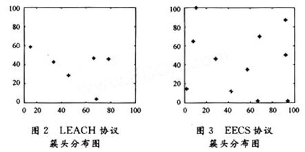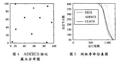 LEACH簇頭個數(shù)取最優(yōu)值。在仿真中,LEACH簇頭個數(shù)為6;取T=0.15,R=26,w=0.8。由3種協(xié)議的簇頭分布圖(圖2~圖4)可以看出,LEACH協(xié)議簇頭隨機分布;EECS協(xié)議簇頭分布比較均勻,但存在簇頭漏洞問題;ADEECS協(xié)議簇頭真正實現(xiàn)了均勻分布。所以,提出的延遲發(fā)送競選消息的方法很好地解決了LEACH和EECS協(xié)議在簇頭選舉過程中存在的問題。