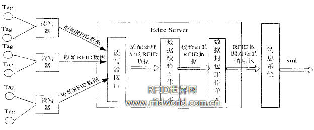 Edge Server結構描述如圖2所示。其中,讀寫器接El完成數據采集和數據適配處理工作;數據校驗工作單元完成對來自讀寫器接El的數據的校驗;數據封包工作單元對來自校驗工作單元的RFID數據,依據數據內容將這些RFID數據打包成不同的消息,傳遞到RFID中間件的下一個功能單元------消息系統中。