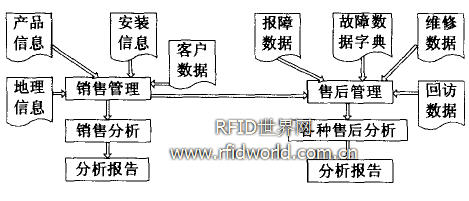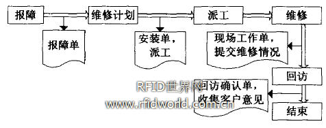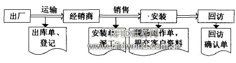 銷售工作流程如圖2所示。在圖2中.銷售管理過程中.產品出庫需要掃描電子標簽.登記產品出廠情況:在經銷商處.經銷商可連上互聯網登記產品到貨情況:在產品出售后,提交安裝單。由經銷商派工,安裝人員到現場安裝后,用手機與讀卡器掃描產品RFID。錄入相關安裝與客戶信息傳送提交到本部服務器。客服人員在收到安裝人員提交信息(在系統中自動形成)后,應適時進行客戶回訪(電話),登記回訪情況。至此,銷售完成。