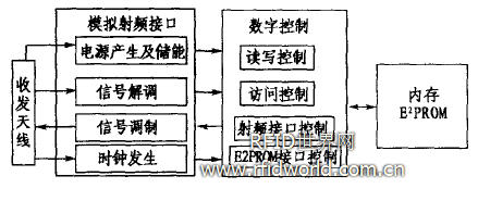(1)模擬射頻接口模塊:包括射頻收發(fā)天線、負(fù)責(zé)將射頻訊號(hào)轉(zhuǎn)換成DC電源的電源產(chǎn)生電路、電能存儲(chǔ)電路、信號(hào)調(diào)制和解調(diào)以及時(shí)鐘發(fā)生電路。