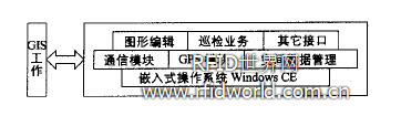 嵌入式GIS系統(tǒng)應用軟件的系統(tǒng)結(jié)構(gòu)因具體應用的不同而有所增減。如圖2所示為嵌入式GIS系統(tǒng)應用軟件所應具備的幾個基本功能模塊。通常該類系統(tǒng)最底層應為嵌入式操作系統(tǒng)Windows CE,然后上面依次為核心處理層和應用邏輯層。整個體系結(jié)構(gòu)與GIS工作站和WebGis系統(tǒng)進行數(shù)據(jù)交互,便于進行業(yè)務裁剪和對外發(fā)布。