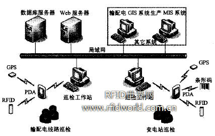該系統(tǒng)由采集終端(GPS接收器、RFID和條碼閱讀器)、移動終端(PDA類掌上電腦)、巡檢工作站、WEB發(fā)布服務器和數(shù)據(jù)庫服務器組成如圖4。方便靈活的插件式設計可以和第三方系統(tǒng)如輸配電GIS系統(tǒng)和生產(chǎn)MIS系統(tǒng)進行對接,使電力企業(yè)的信息平臺做到最大化的信息共享和應用。