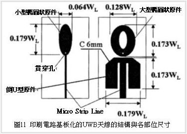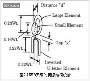 圖2是UWB天線的結構設計范例,如圖所示假設最低使用頻率的波長為Wz時,大型橢圓狀原件與倒U字形原件的高度大約是1/4Wz,本設計分別使用0.23與0.22波長。