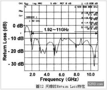 利用模擬分析獲得的參數制成的UWB天線,進行實驗性微調最才后將d設為5mm。圖7是UWB天線的Return Loss特性測試結果,如上所述美國聯邦通訊委員會( FCC)將UWB的頻寬定義為3.1~10.6GHz,根據測試結果顯示本天線在2.4~12GHz頻率范圍內具有良好的放射Pattern,此時Return Loss低于9.5dB,VSWR則低于2.0dB。