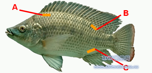 本項測試先設(shè)計製作一壓克力之橢圓型環(huán)形水道測試平臺 (圖5)。平臺長邊一側(cè)中央設(shè)一插槽,可將製作好的長方框型低頻LF讀取天線固定。同時使用吳郭魚為測試魚種,當(dāng)魚體通過天線時,觀察魚體內(nèi)的標(biāo)簽是否被讀取 (圖6)。另為瞭解標(biāo)簽注射植入魚體中之部位對水中實際讀取性能之影響,將四種不同廠牌型號的LF電子標(biāo)簽以與魚體平行方向分別植入魚體的三個不同部位A、B、C如圖7所示。
