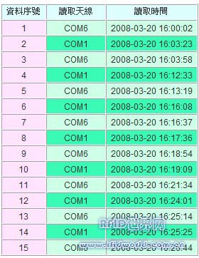 測試時使用兩組TI讀取器及天線之內(nèi)部連續(xù)讀取功能,以連線電腦針對同一時間所讀取之兩組資料 (分別經(jīng)由COM1及COM6串列埠介面) 進行紀(jì)錄及儲存,其資料格式可轉(zhuǎn)換為EXCEL檔。