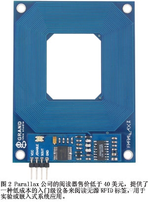 多數嵌入式RFID應用都需要一種專用閱讀器作為設計的一部分,以便解釋本地標簽。自動售貨機很好地說明了嵌入式RFID應用。這種機器能借助內置閱讀器來接受RFID卡的非接觸支付。另外,如果發售的物品有標簽,則機器還能了解其庫存,以便自動訂購補貨。小型低成本嵌入式閱讀器對于這些應用很關鍵,TI、SkyeTek、Parallax等公司供應此類閱讀器。例如,Parallax公司與Grand Idea Studio公司合作開發的一種低成本RFID閱讀器模塊在無源轉發器標簽中工作,用于門禁、自動識別、機器人、導航、庫存跟蹤、支付系統、轎車發動機防盜鎖等應用 (圖2)。該模塊具有2400bps串口,并需要5V直流電源。Parallax閱讀器起價低于40美元。