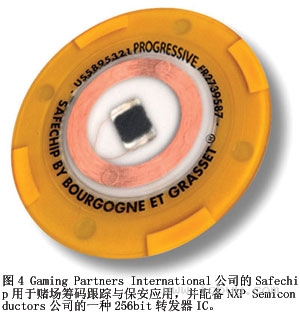 嵌入式RFID技術還非常適合于快速桌面賭博,其中的作弊和手法是難以檢測的。借助適當的數據記錄工具,賭場經營者就能監視參賭者的行動,以便檢測撲克牌的計數,調整獎勵,并盡量減少發牌者的錯誤。例如,International Game Technology公司和Progressive Gaming International公司聯合開發了Table iD桌面賭博自動化系統,它結合了一個基于軟件的桌面管理器和一系列RFID芯片掃描模塊。最新的RFID賭博芯片工作于13.56 MHz,存儲容量超過10 kbit。在賭博期間,每個位置的芯片閱讀器識別并記錄每個參賭者的賭注。Table iD系統計算參賭者的下注模式,總結發牌者的活動,并且每小時記錄一次參賭者所做的決定。該系統無需用戶干預就能自動更新平均賭注和輸贏記錄等信息。有幾家供應商在制造適合于賭桌自動化并基于RFID的賭幣。例如,Gaming Partners International公司在生產Safechip by Bourgogne et Grasset(圖4)。