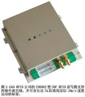 對于更耐久的應用或工業應用,GAO RFID公司提供一種UHF RFID讀寫器,它支持兩根外部天線(圖3)。236002型工作于902MHz~928MHz頻帶,面向高速倉儲、分銷、制造應用。該模塊能在7m距離識別以10m/s速度運動的物體。該模塊需要12V直流電壓,并通過串行RS232或以太網接口通信。