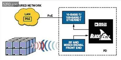 乙太網路供電(PoE)網路是一種簡化有線基礎架構的方法,相當適合這類型的應用。在低功率應用方面,IEEE 802.3 a/f PoE可以應付連上網路的系統。如圖4中所示,一組PoE系統會包含有供電設備(PSE)以及受電元件(PD)。PSE提供電源至乙太網路線,而PD(針對本文所討論之目的而言)則由匯聚式網路處理器以及其周邊的元件所構成。PoE的最大纜線長度建議值為100公尺,由于其具有相對的機動性以及可以省去傳統的ac配線以及插座相關的成本,因而適用于許多嵌入式RFID應用領域。