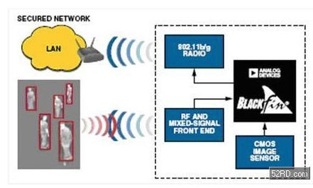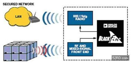 Blackfin處理器能夠藉由序列或是平行介面與802.11晶片組連結。此外,由于這些處理器具有強大運算能力,因而能夠支援split - MAC以及full - MAC 802.11 a/b/g的執行。舉例來說,在對CompactFlash 802.11b卡進行系統整合時可能需要的full-MAC,是透過Blackfin的非同步記憶體埠來加以接合;而split-MAC的執行通常則是透過SPORT或是SPI介面來做接合─較低(lower)MAC會存在于無線晶片組上,而較高(upper)MAC則是在Blackfin的軟體中執行。
