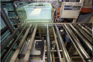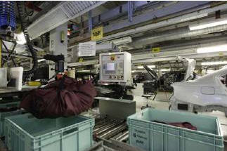 系統(tǒng)可依據(jù)這項(xiàng)資訊,將運(yùn)送箱存放至指定位置。如果對(duì)應(yīng)的車體是從高架存放設(shè)施輸送到組裝線的起點(diǎn),中央電腦也會(huì)依據(jù)該訂購編號(hào),調(diào)度相關(guān)的裝配生產(chǎn)線,系統(tǒng)會(huì)從存放地點(diǎn)取出裝配生產(chǎn)線,經(jīng)傳輸站臺(tái)再次辨識(shí)后,再分派到組裝制程。在裝入車體前,第三個(gè)站臺(tái)會(huì)再次確認(rèn)資料,之后便會(huì)將儲(chǔ)存的資料清除,以主動(dòng)避免日后發(fā)生混淆。