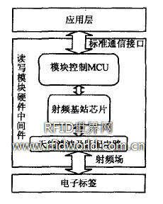 參考中間件的通用定義,結(jié)合嵌入式系統(tǒng)特點,設(shè)計了本讀寫模塊硬件中間件結(jié)構(gòu),如圖2所示。向下屏蔽了電子標簽、射頻基站芯片等硬件環(huán)境的差異,向上為RFID應(yīng)用層提供標準的軟、硬件接口應(yīng)用層的開發(fā)基于該接口進行,無需考慮RFID 的實現(xiàn)細節(jié),且不管底層的硬件怎樣更新?lián)Q代,只需將中間件升級更新,并保持該中間件的對外接口定義不變,應(yīng)用軟件幾乎不需做任何修改,從而提供了一個相對穩(wěn)定的高層應(yīng)用環(huán)境。
